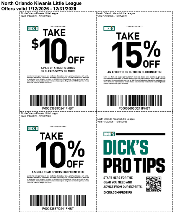As a proud supporter of our league, DICK’S Sporting Goods provides our families with exclusive discounts that are VALID YEAR-ROUND!